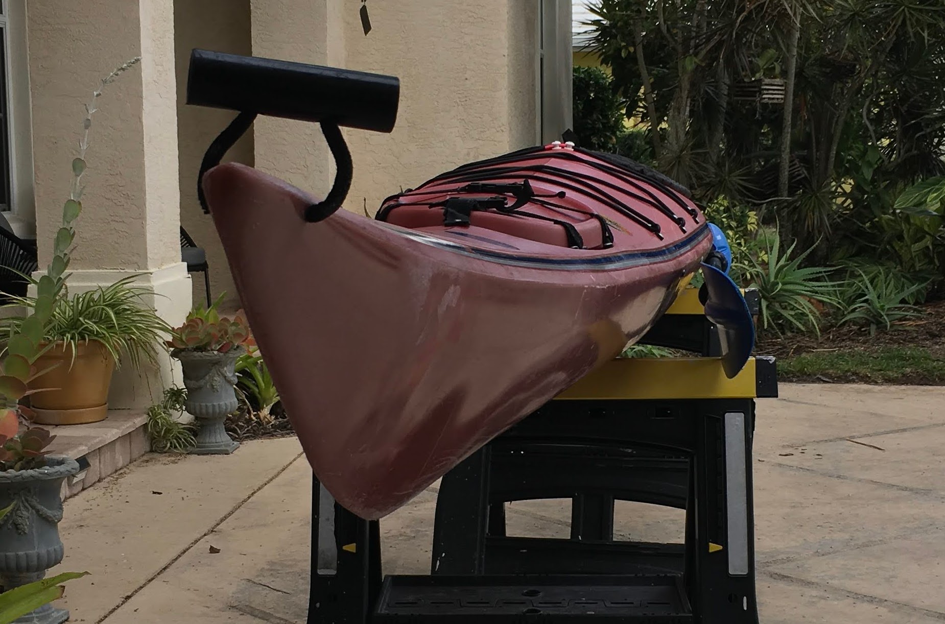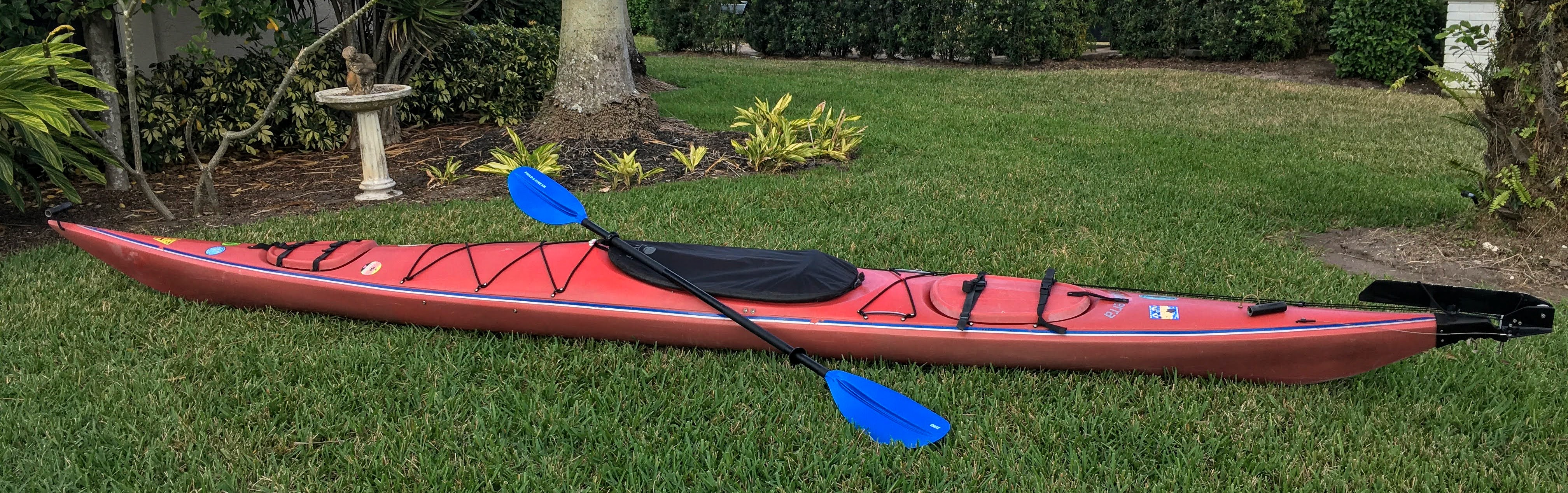 This kayak has had all the deck roping replaced with added tube hand holds, the rudder assembly and foot slides have The seat-back roping and bungee have been replaced to provide an easy adjustment setting to raise or recline the seat back. The adjustable foot pegs can handle any paddler (shortest recommended inseam for foot-pegs is 30”) The rear hatch cover has a double strap for additional on-deck gear storage for multi-day trips. Equipped with front and rear carry handles .