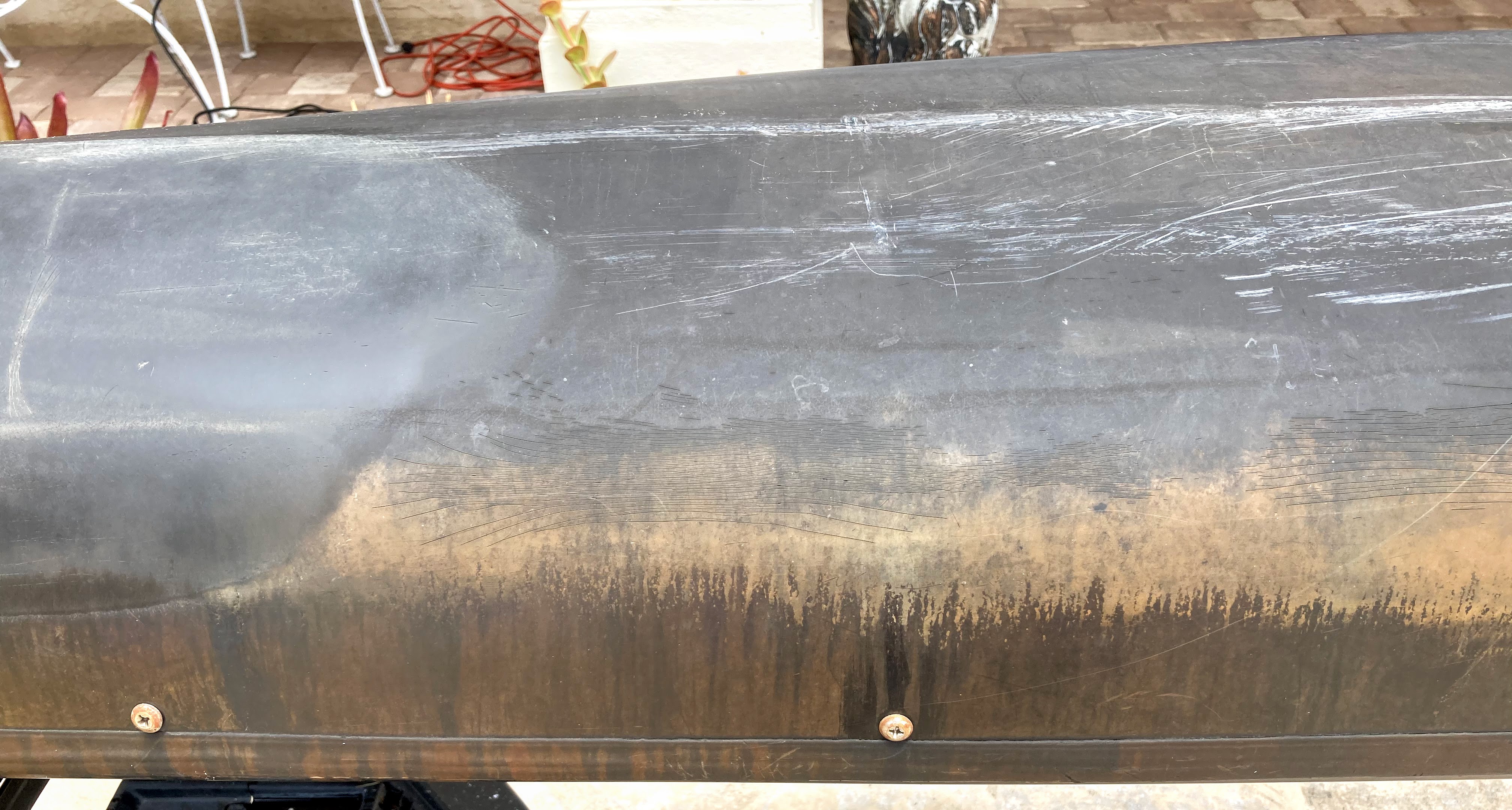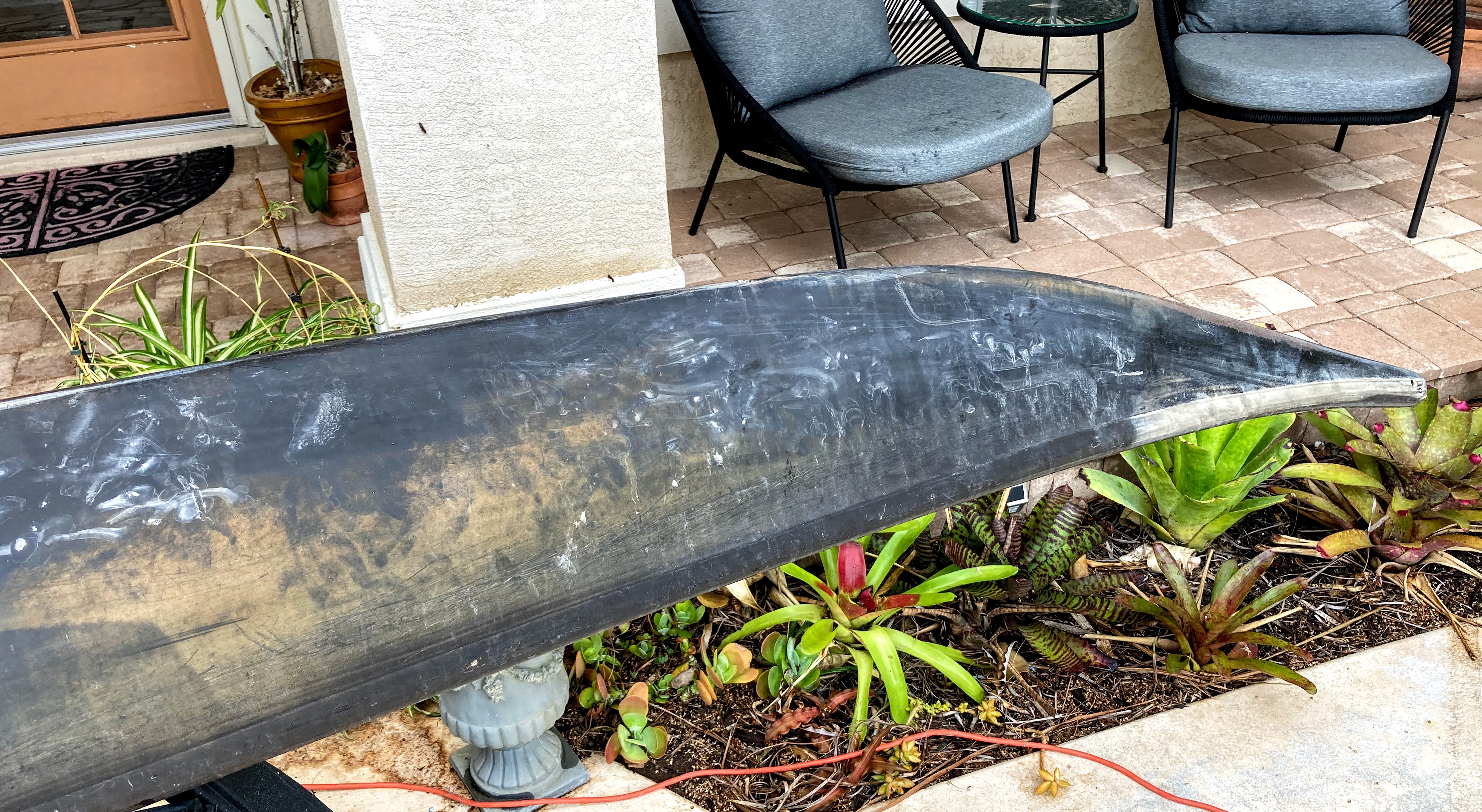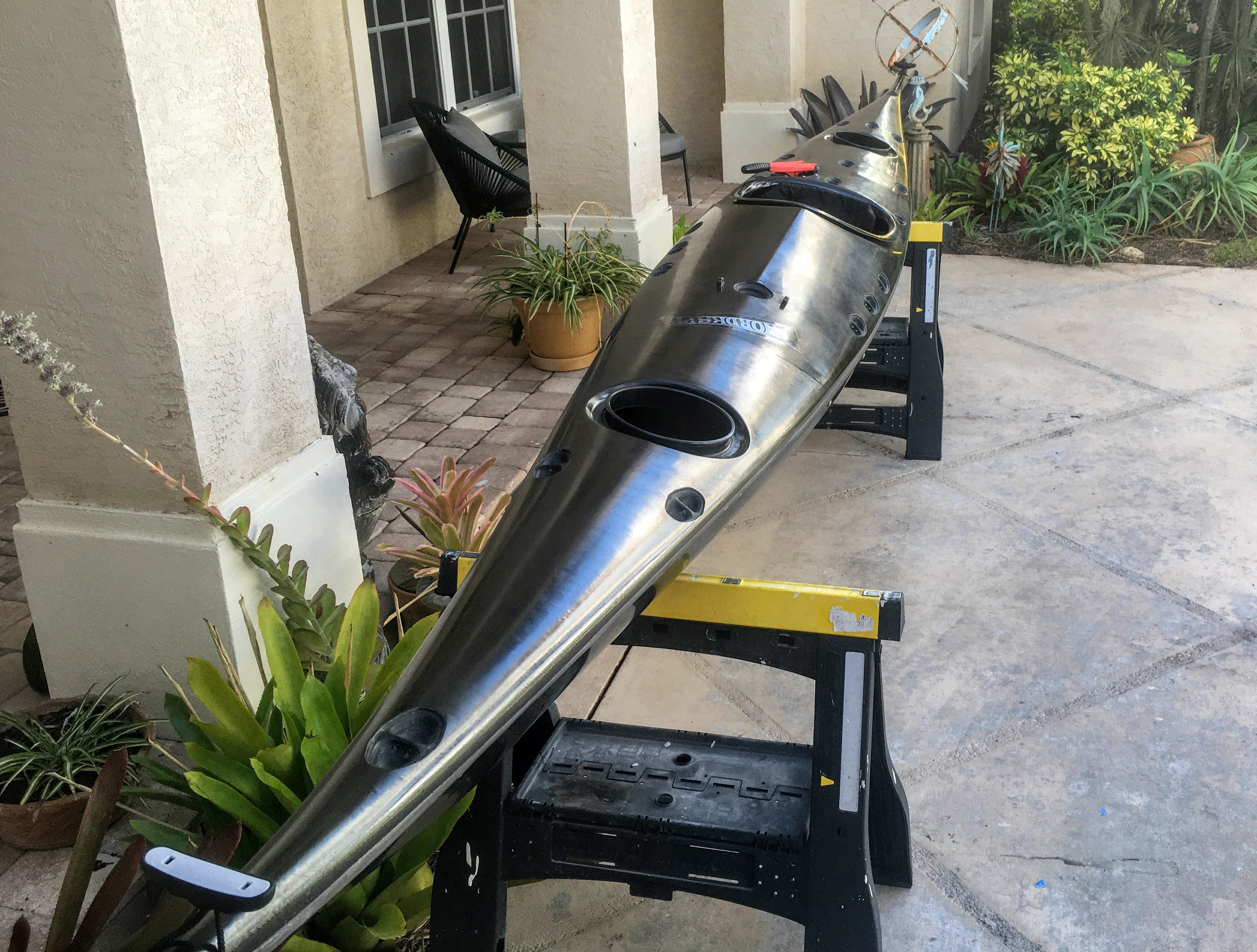 The first day I needed to strip all the old rigging off, then clean out the several pounds of sand, leaves and pine cones from inside the cockpit and open hatches. Then I power-washed as much of the grime as I could from the outside and inside. It took a few sessions of power-washing to get it clean. The second day, I started on the hull bottom, by hand, with 320 wet sandpaper to remove years of iron staining from what appeared to be from a well irrigation system and the kayak being in line with a sprinkler head. I then took a buffer, using Mequiar’s Ultra-Cut Compound. This process is time consuming and took over four hours on just the bottom.