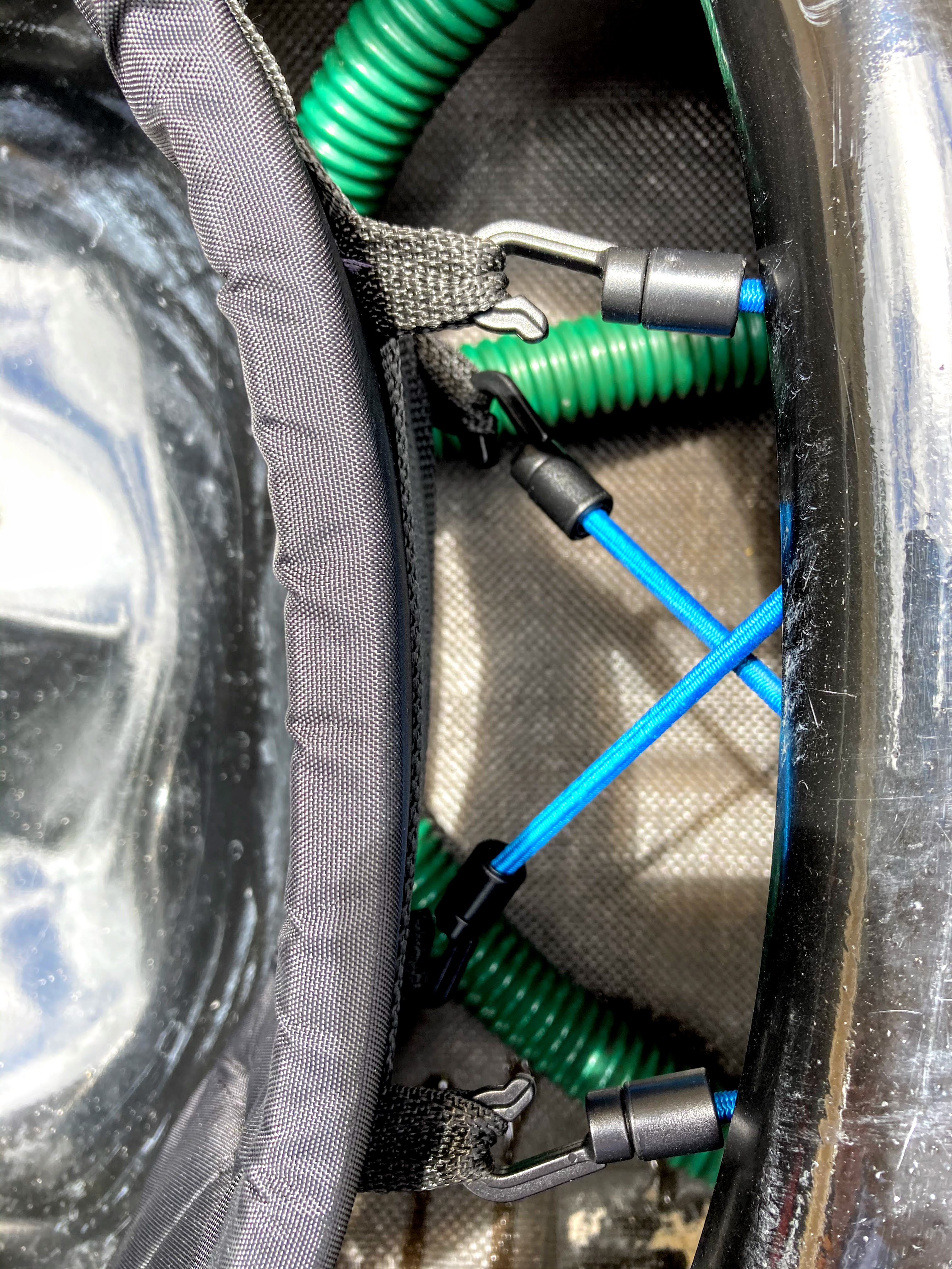 Now the fun part begins: Adding the new seatback, which this boat was never equiped with, telling me the original owner must have been a traditionalist, using all core muscles for paddling. I added new hatch covers (they are attached from below and anchored underneath to the deck), the new bungee cording, perimeter roping and new handles.