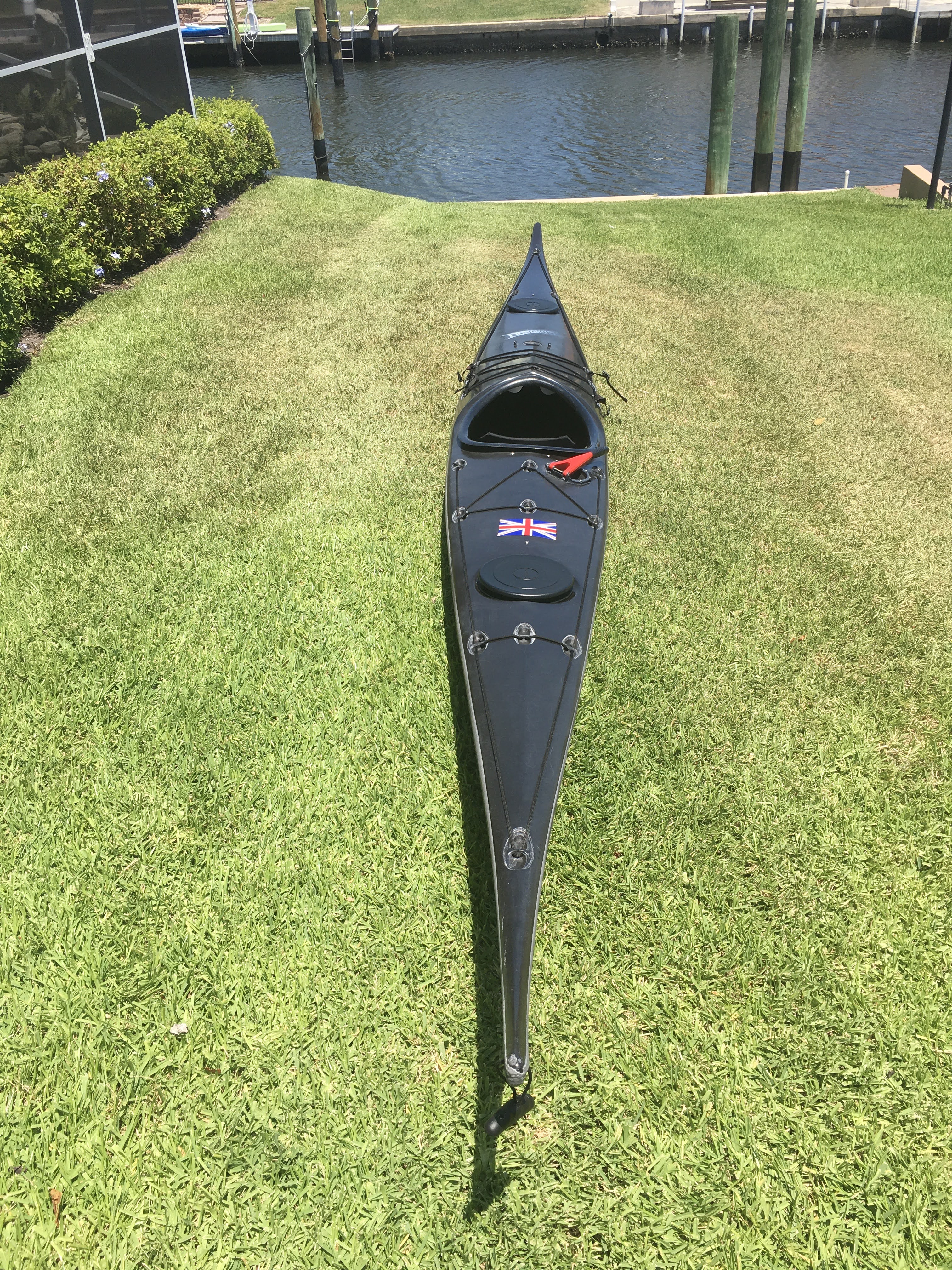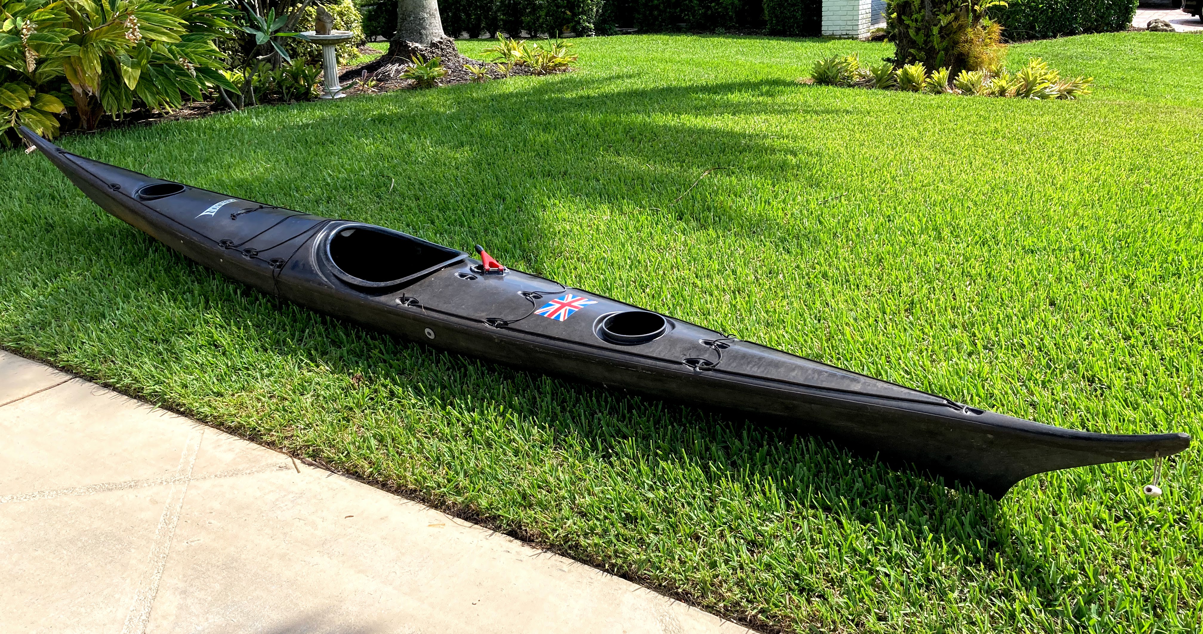 It’s been awhile since something great came across the selling boards, but I look every day and late yesterday a blurred image caught my eye. I am grateful the seller posted some spotty images of this boat, otherwise the keen eye may have snapped this one up before I had a chance, but I got to it pretty early. When I arrived at the sellers home, he told my he had picked this up at a very large waterfront home in Jupiter that he was involved in an estate buy. It was in serious need of some TLC and I originally thought someone had hand painted it black, but realized it was the original custom color (unusual for the 1980’s). The boat looked to be very workable, with only some minor glass repair work on the keel and a lot of man-hours power washing and compounding the surface back to life. It will need all new deck rigging, hatch covers, and a seat-back, which fortunately I have in my stockpile for this era craft. If this turns out the way I think it will, then this beauty gets added to my personal quiver, an awesome compliment to my modern Rebel Ilaga and vintage P&H Baidarka Explorer.