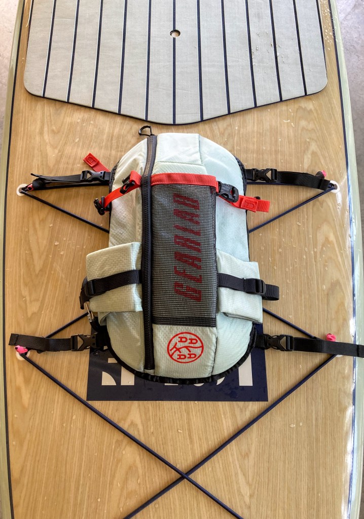 I have used, and love, this GearLab DeckPod for my kayaks and most recently my SUP Board. It holds a 2.0 Ltr. water-bladder and has decent length sipping hose that tucks neatly out of the way but easy to extract for use. There are two side velcro and strap catches for holding just about anything from hand-pump to paddle float to footwear, towels, etc. Inside there is plenty of room for small gear and a great place to store your phone (water-resistant) on ice so it does not overheat in the sun. This is not a water-tight bag but one that is breathable. I would suggest buying a few sets of side mounting straps so you can just transfer the DeckPod from one craft to the other in 4-snaps.