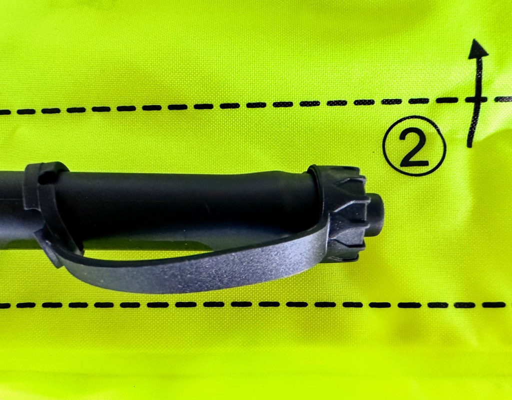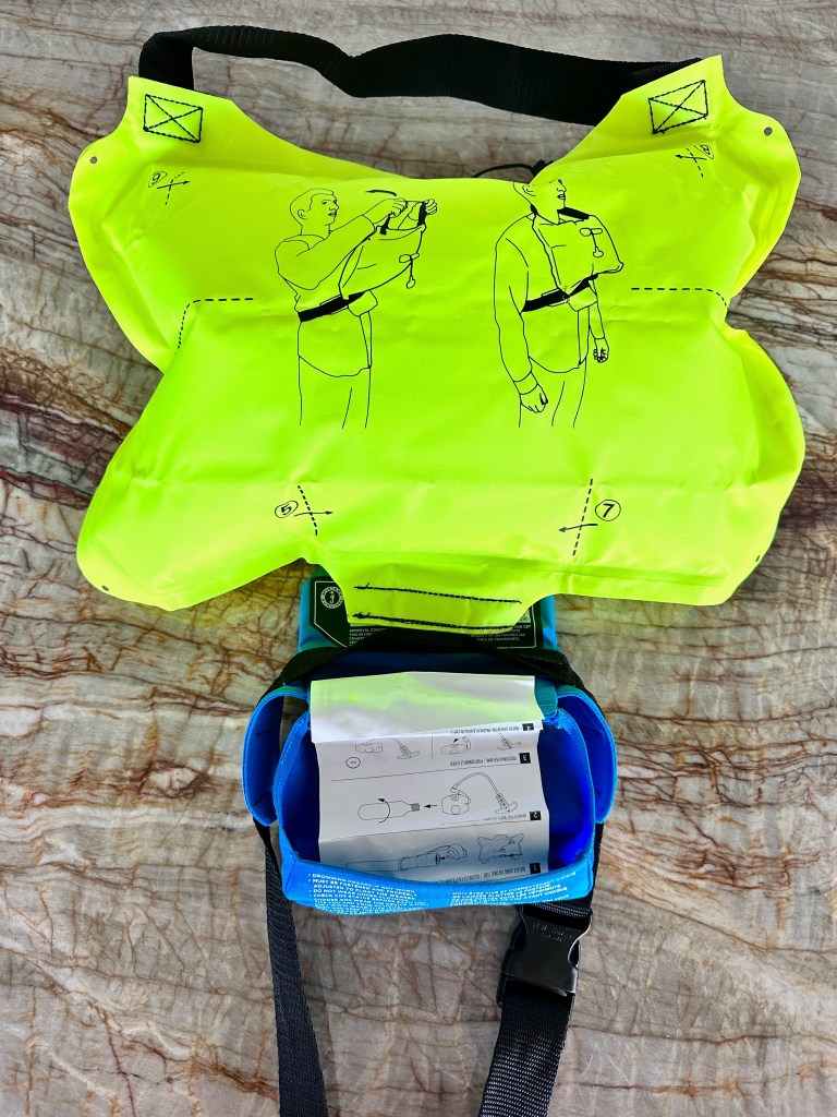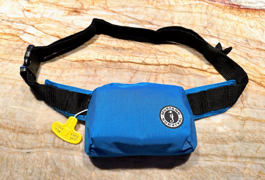 This is a pillow style PFD, meaning the inflation is in the front, keeping your upper torso and head above water. There are some nice features of this product that won my attention: 1) Size. The pillow pack measures 7 inches across, keeping it out of the way; 2) Well constructed; 3) The manual inflator tube has a self-sealing valve with end-cap to prevent water entering while stowed; 4) Easy to reassemble back into the pouch with a little practice. If you are good with origami–no problem. LOL.